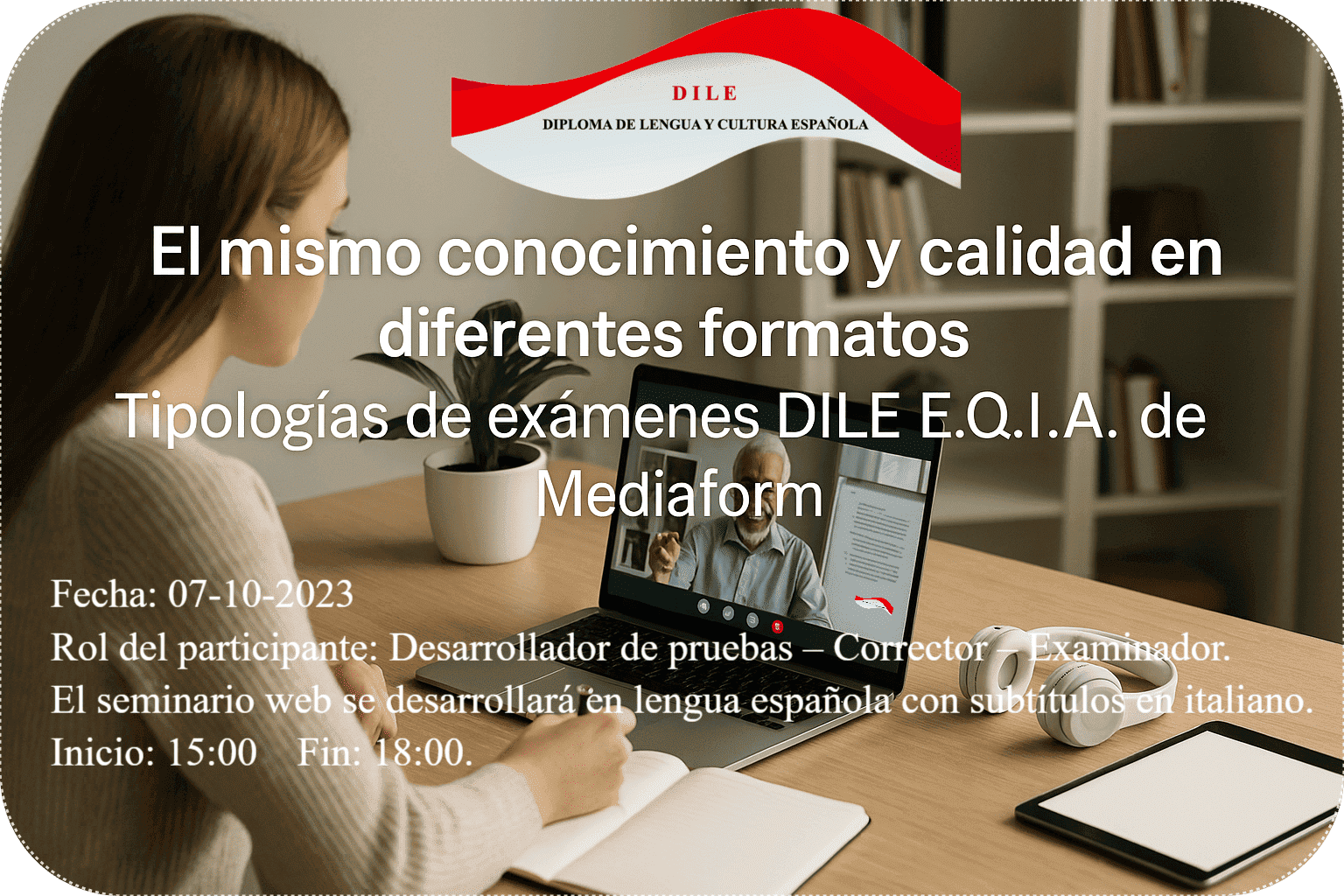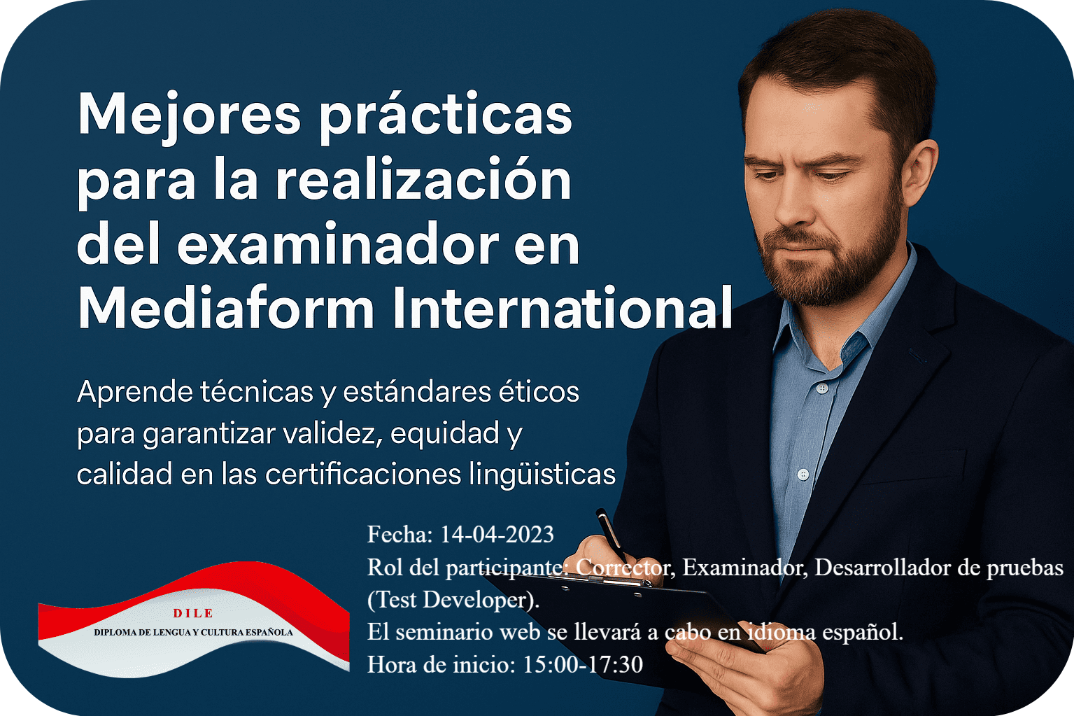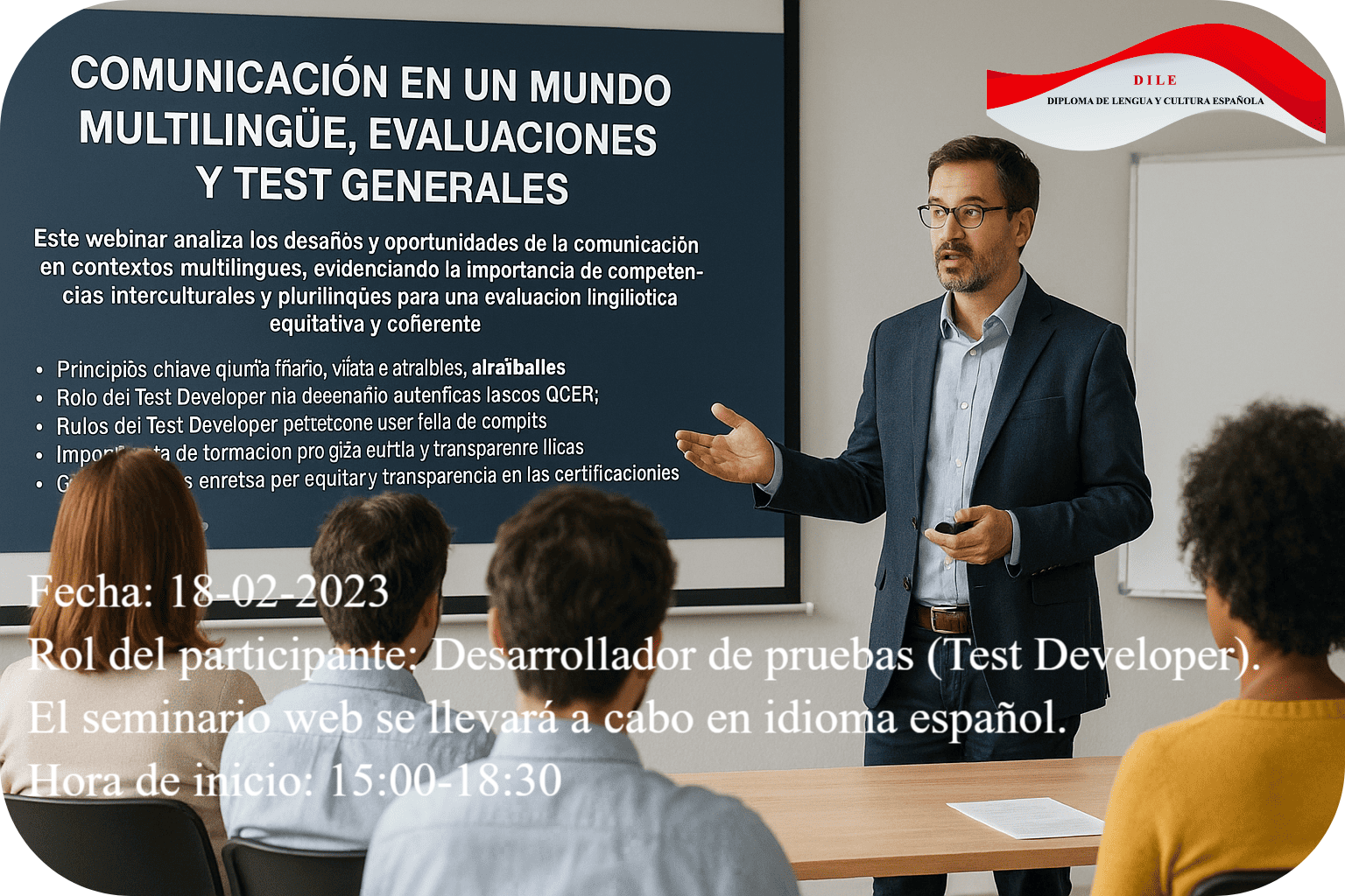Il webinar è destinato al personale di Mediaform DILE coinvolto nel programma di certificazioni, per Test developer del Diploma de Lengua y Cultura Española. L’evento fornirà strumenti e metodologie per progettare prove comunicative autentiche in contesti multilingui, garantendo validità, equità e coerenza con gli standard del QCER, a supporto della qualità e dell’affidabilità delle certificazioni linguistiche.