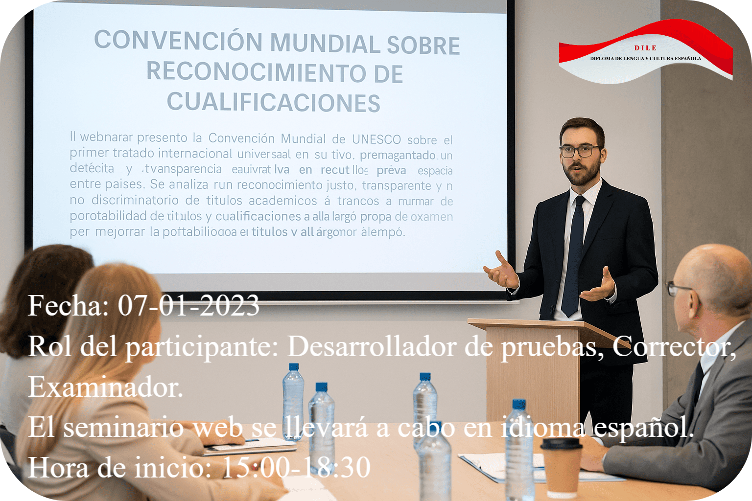 Il webinar è destinato al personale di Mediaform DILE coinvolto nel programma di certificazioni, per Test developer, Correttore ed Esaminatore del Diploma de Lengua y Cultura Española. L’evento offrirà una panoramica sulla Convenzione Mondiale dell’UNESCO sul Riconoscimento delle Qualifiche, evidenziando il ruolo del personale valutatore nella progettazione, correzione ed esame delle prove in coerenza con gli standard internazionali (MCER, EQF), al fine di favorire il riconoscimento equo e trasparente delle certificazioni.