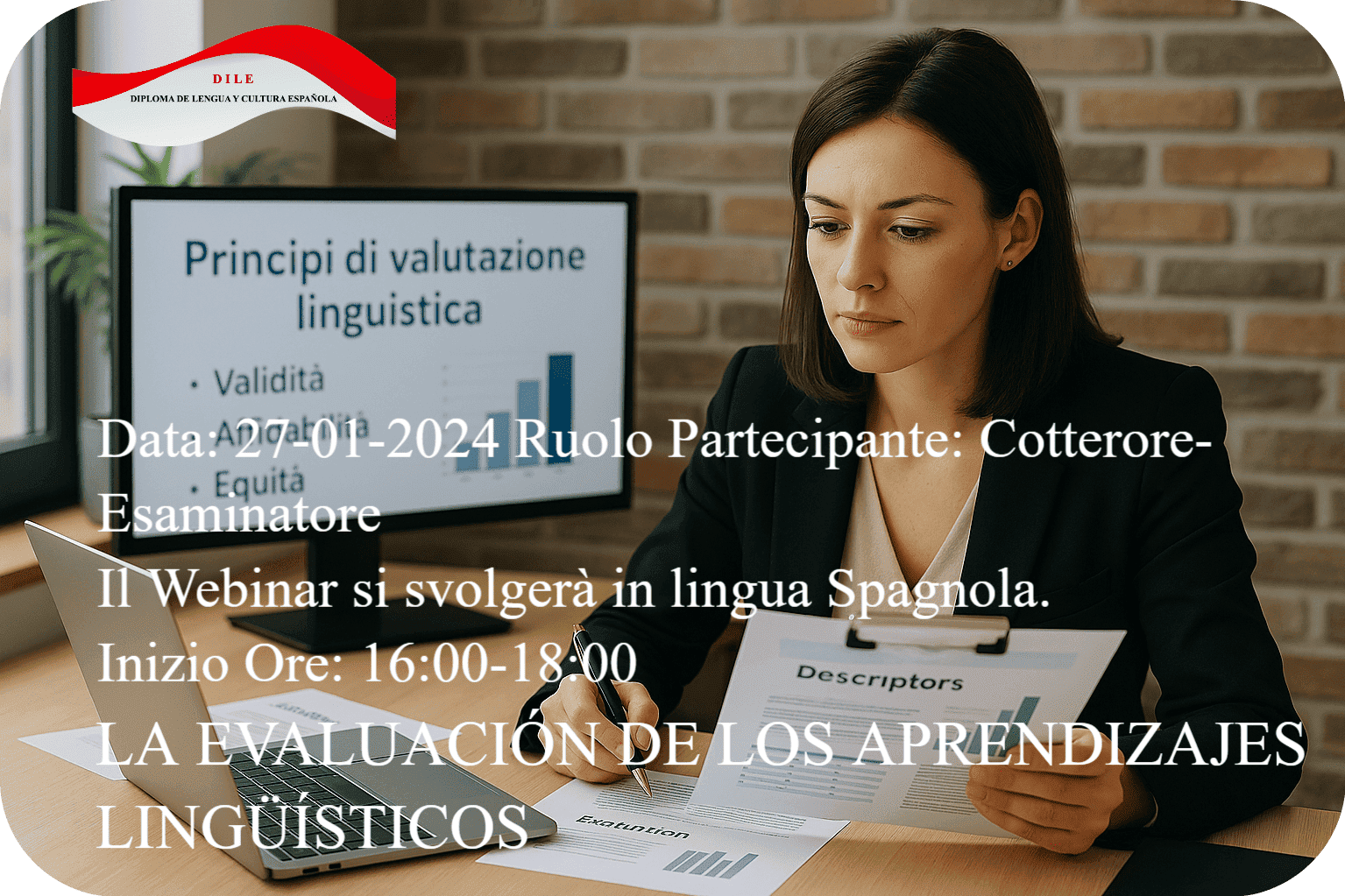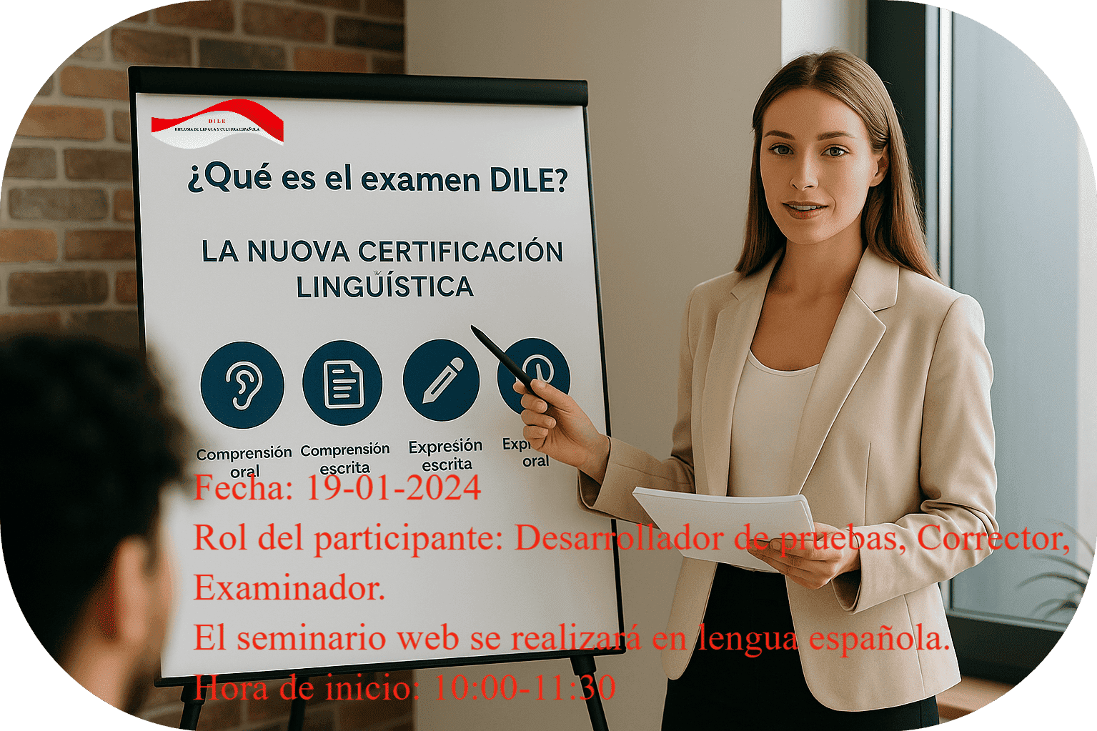 Il webinar presenta la struttura, i fondamenti e gli obiettivi dell’esame DILE (Diploma Internacional de Lengua Española), allineato al Quadro Comune Europeo di Riferimento per le Lingue (QCER).